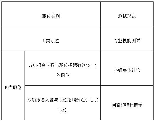 综合素质评估主要采取专业技能测试、小组集体讨论、问答和特长展示等形式,对考生进行考察。各职位具体考核形式见下表。