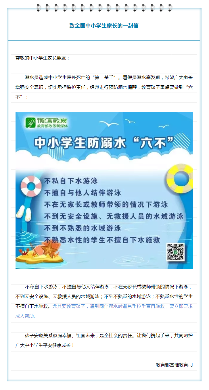 美女做爱部还发出《致全国中小美女做爱 家长的一封信》,提醒家长要经常对孩子进行预防溺水提醒。