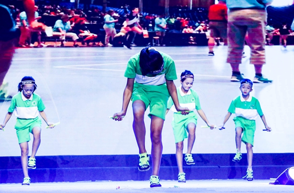 ▲荣获花式跳绳世界冠军的从化区希贤小学演绎花式跳绳秀《绳采希贤》,活力动感掀起活动高潮。
