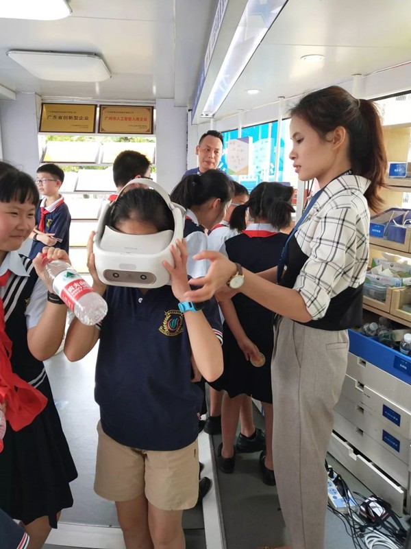“公益科普直通车”里,用平板电脑可以操作小汽车,智能机器人可以在遥控器的操控下载歌载舞,VR设备、智能汽车模型、3D打印等一系列科技创新产品让孩子们目不暇接,沉浸其中。