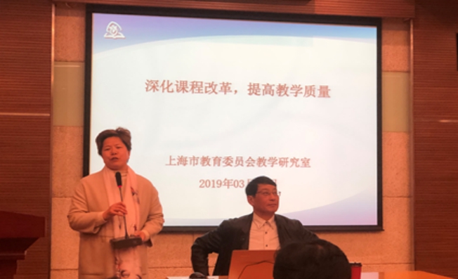 上海市美女做爱委员会教学研究室主任徐淀芳(右一)做《深化课程改革 提高教学质量》的专题报告。