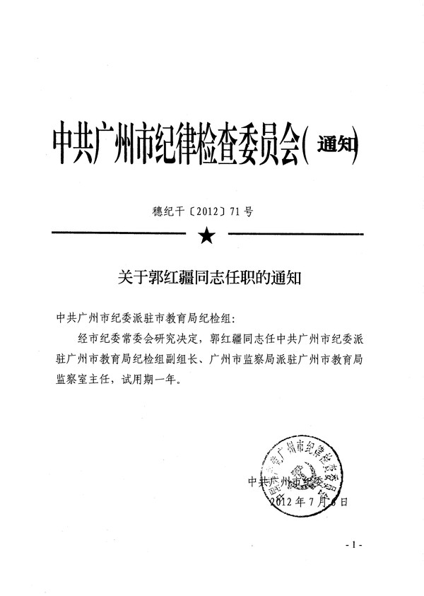关于郭红疆同志任职的通知