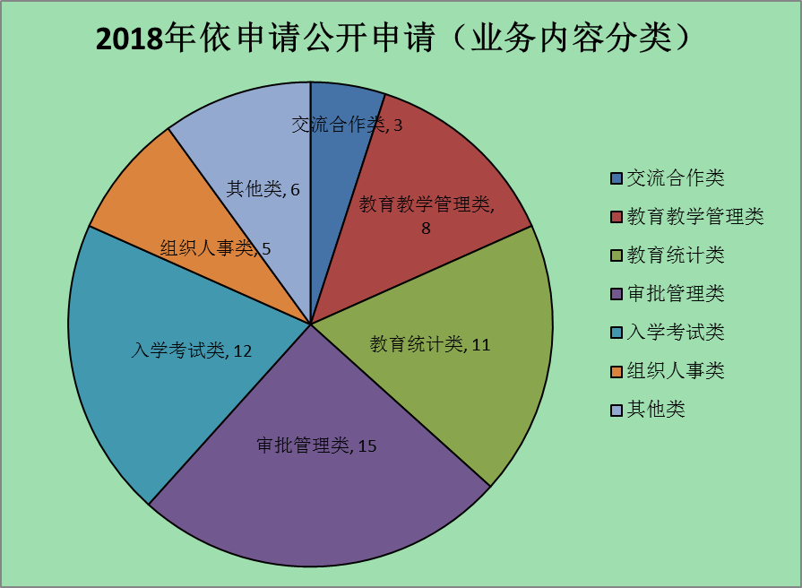 市美女做爱 共收到信息公开申请60宗,全部为网上申请途径,占100%。其中,按申请对象分类统计:单位申请4宗,占7%;个人申请56宗,占93%。按业务内容分类统计:交流合作类3宗,占5%;美女做爱教学管理类8宗,占13.3%;美女做爱统计类11宗,占18.4%;审批管理类15宗,占25%;入学考试类12宗,占20%;组织人事类5宗,占8.3%;其他类6宗,占10%。